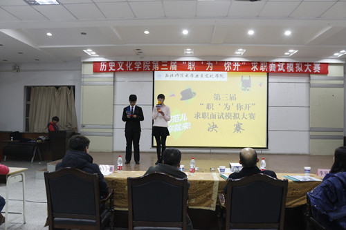 当晚决赛共设“职场亮剑”、“职说方圆”、“职面未来”三个环节。在“职场亮剑”环节选手们通过PPT和才艺展示进行了精彩的个人简介,通过精彩的舞蹈、唱歌、吹口琴、书法、烹饪、诵诗等才艺表演,评委与观众都对选手们有了初步了解;在“职说方圆”环节中,参赛选手通过对工作中可能出现问题的应对方法的表述,展现了自己处理实际问题的能力,他们极强的应变能力不仅令现场观众折服,也获得了评委一致赞同。在最后一环节“职面未来”中,选手角色互换,分别扮演求职者和面试官进行轮流作答,激烈的气氛一直持续到比赛结束。在评委点评环节中,由尚季芳、李家莉、王新春等老师及学生代表组成的评委组对参赛选手流畅的语言表达能力和大方得体的举止表达了赞赏,最终商议评定,徐东明、左凯文、张泽炜同学分别获得本次比赛的冠、亚、季军。