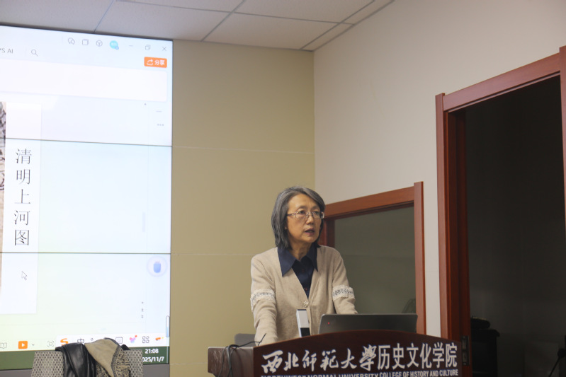 报告开篇,吴荭老师结合文献记载与考古发现,系统梳理了高台地区从《禹贡》所载时期至商周、汉晋的历史脉络,详细介绍了高台县地埂坡墓地地理位置及考古发现。接着,吴老师对4号墓壁画中的4身人物形象展开深度解读,着重从人物的服饰、发型及活动内容等进行分析,同时结合秦兵马俑、历代壁画、《清明上河图》等相关资料,使同学们对壁画中涉及的“斜幅”“行滕”“胫衣”“髡发”“鼓吹”“角抵”等概念有了清晰认识。最后,吴老师对壁画中人物族属进行了讨论,系统梳理了鲜卑人群的发展演变情况,认为壁画人物为鲜卑族。