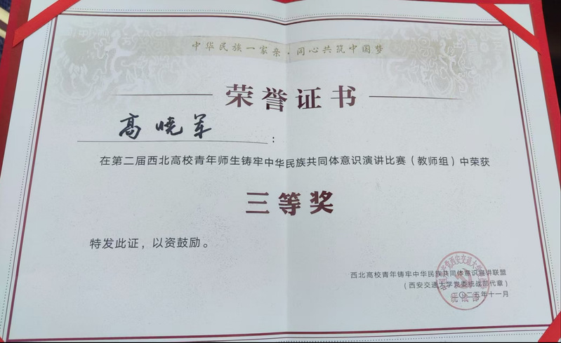 11月14日,由西北高校青年铸牢中华民族共同体意识宣讲联盟主办的“西北高校青年铸牢中华民族共同体意识宣讲联盟第二次会员大会暨西北高校青年师生主题演讲比赛”在兰州大学举行。新葡的京官网青年教师高晓军以《“华夏”——中国人最早追求的身份认同》为题进行演讲,最终获得教师组三等奖。