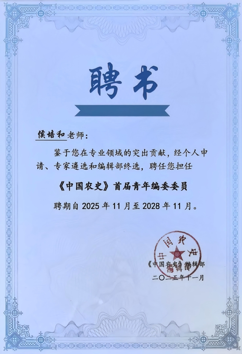 此次《中国农史》设立首届青年编委会,旨在吸纳优秀青年学者参与期刊建设,进一步增强学术活力,推动学科创新发展。侯培和副教授凭借其在专业领域的突出学术贡献,经个人申请、专家遴选及编辑部终审,最终获聘成为青年编委。