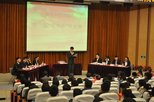 2013年12月19日,由思政课教研部举办的“马克思主义基本原理概论”实践教学系列活动之——第三届“明理杯”辩论赛决赛在图书馆报告厅举行。思政课教研部全体教师以及学院2012级本科专业的400多名学生代表观看了本次比赛。