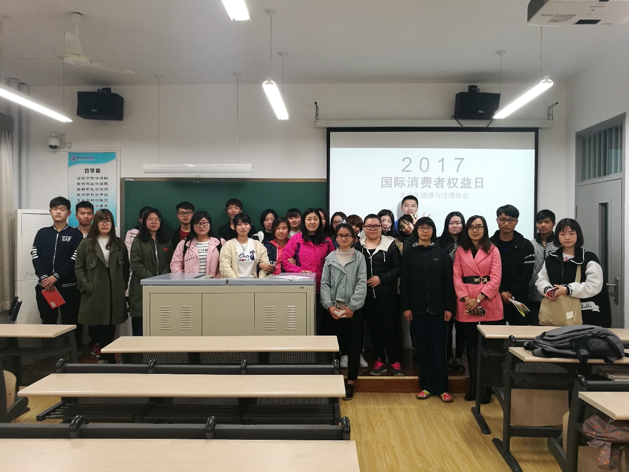 为增强同学们消费权益保护意识,提高维护自身生命及财产安全的能力,在国际消费者权益保护日来临之际,大学生道德法律协会于月11日晚上7点在明略楼106教室开展了“消费者权益与保护”主题活动。协会指导老师孙红竹老师、协会成员及一些对此感兴趣的同学参加了此次活动。