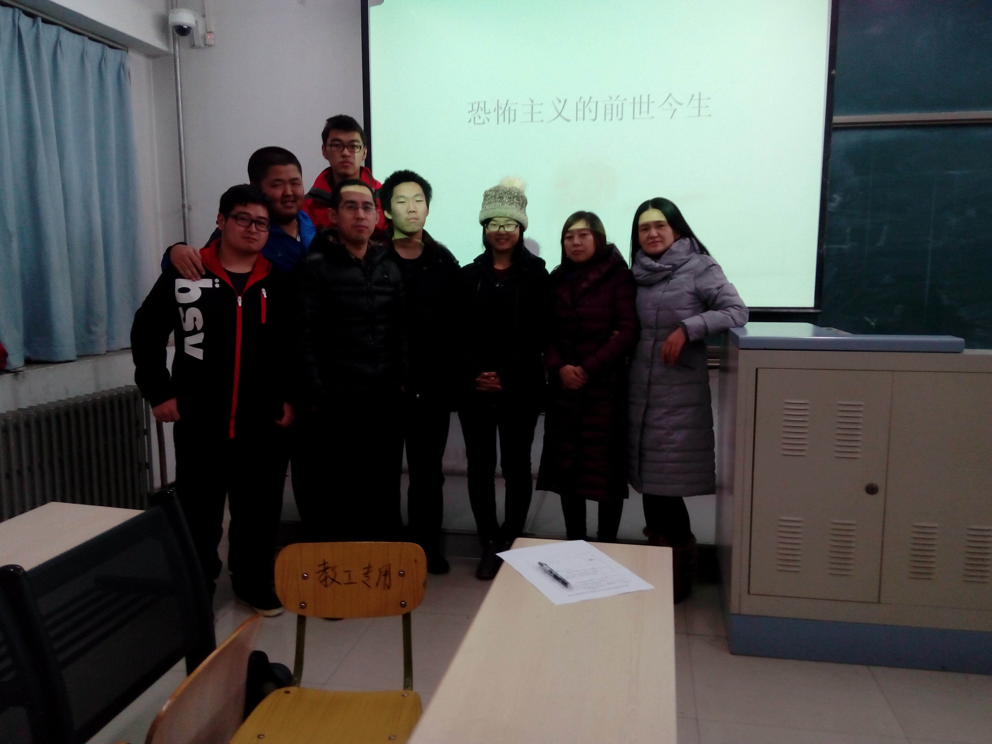 2015年11月27日晚上19点00分大学生时事论坛座谈会在南校召开,主题是“恐怖主义的来世今生以及对我们生活的影响”。指导老师何艳何老师亲临现场,到场的还有思政部刘胜男和刘利民老师。