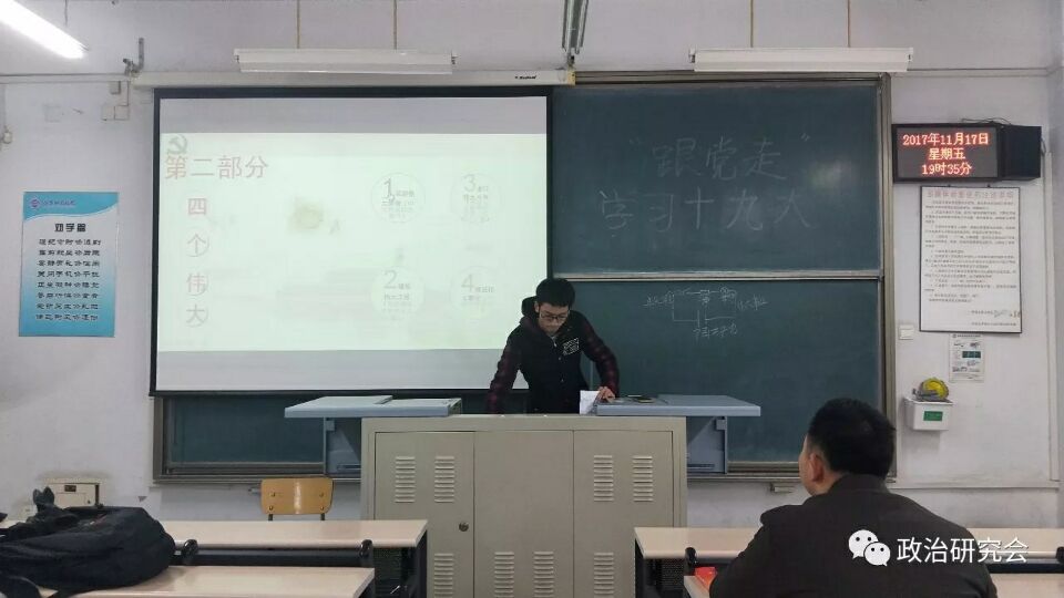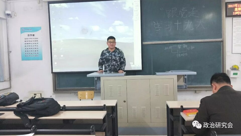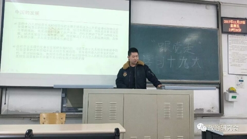 11月17日晚,大学生政治研究会于六号楼508教室开展了“跟党走”学习党的十九大精神主题活动,思政部田艳天老师、孙红竹老师、高衍超老师到场。